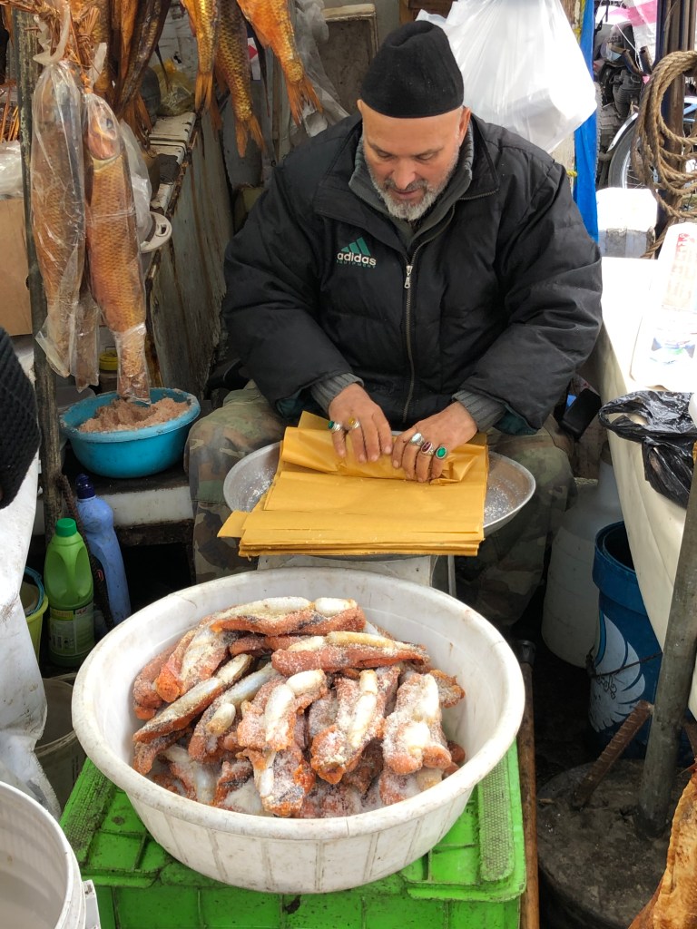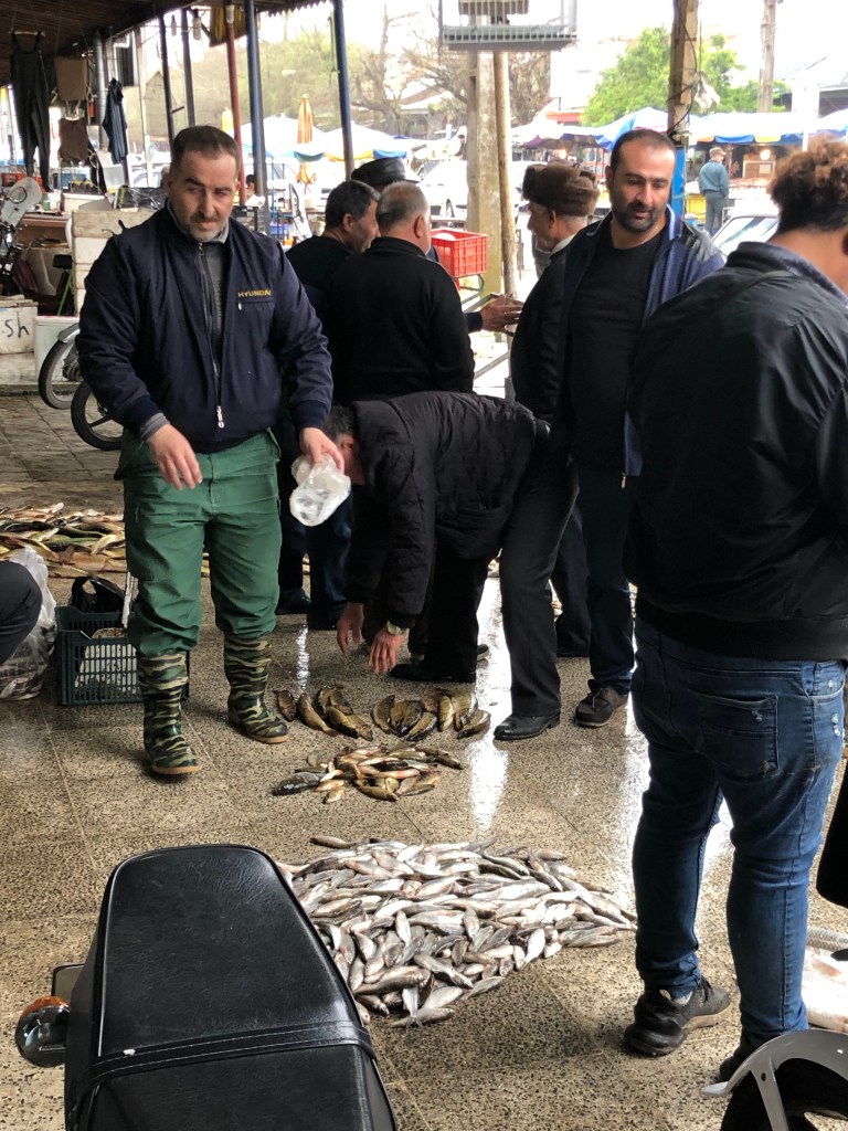 With the good geographical location of this market ( very closed to the Caspian sea and Lagoon), fishermen usually first brought their catch of the day to the local fish dealers here in the early morning. Why to the fish dealer? I was told that fishermen couldn’t sell their fish to others except their dedicated fish dealers according to local traditions. This was because usually fishermen borrowed money from the dealer for their fishing boats and equipments so they were obliged to sell to their lender. (Not sure this is the same practice in other counties?). There were more than one fish dealers in this market. They liked to sort out their fish into grous, then started to shout out very loud to attract buyer to surround them to start the auction process.