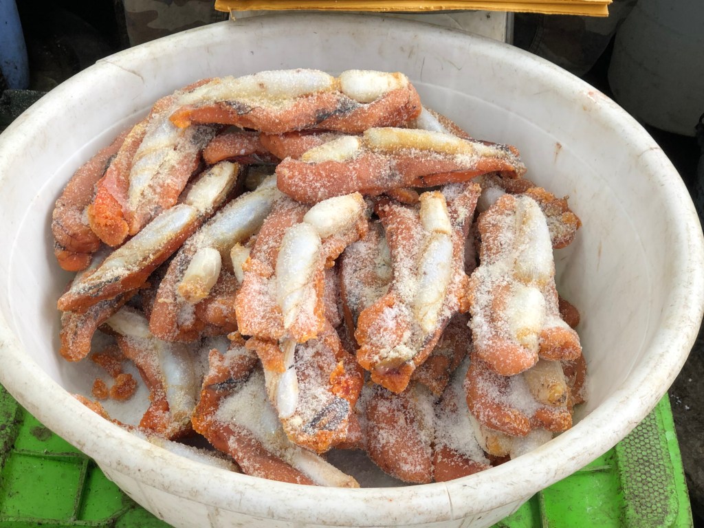 How interesting to see the logistic chain of fish from the fishermen-> the fish dealers -> fish hawkers. On top of fresh fish, local people will also made preserved fish roe and even dry fish. I didn’t manage to eat the big piece and had no idea how to cook would be the best. But I was super tempted to buy one when I saw the salted fish roe 😛 . See how skilful the show runner with many beautiful rings on hands preserving the fish roe.