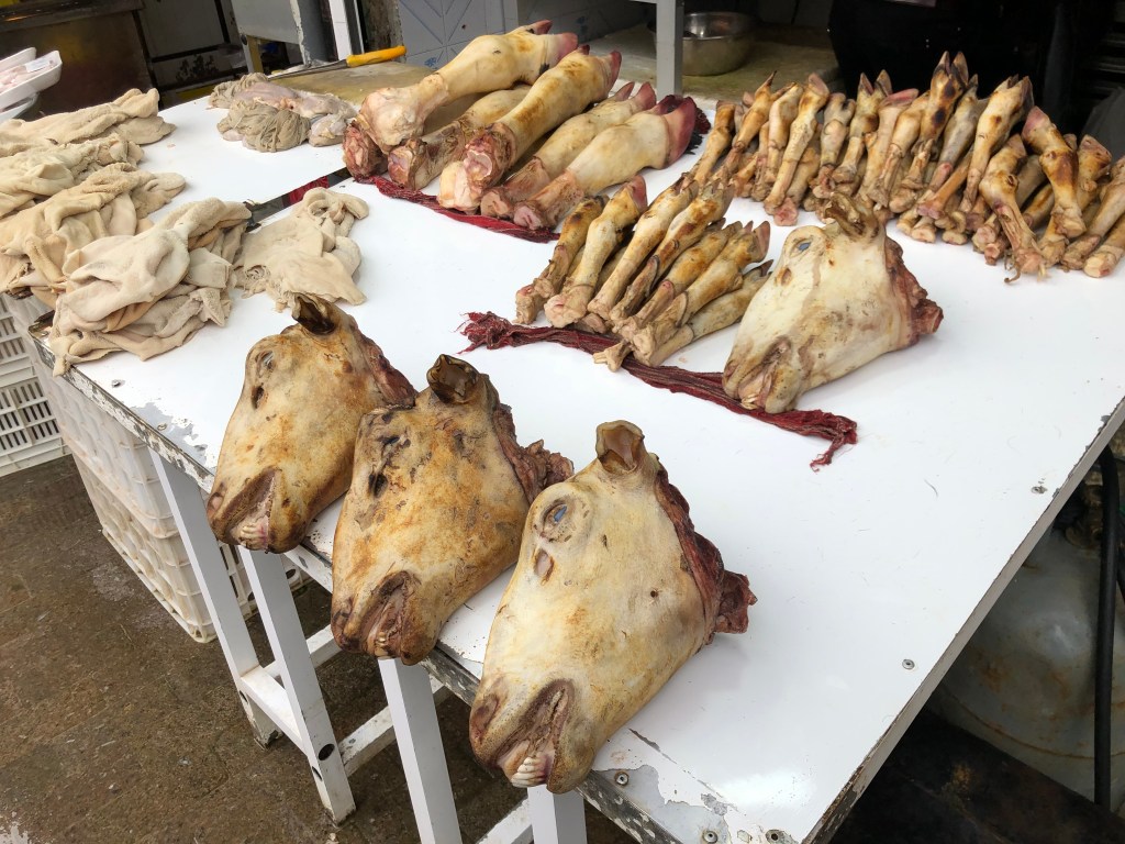 After that, I turned my head to the opposite side of the same sheet to explore. To my surprise!!!!!, I was so shocked that I saw body parts of goat. Indeed, it’s normal in the market to see goat meat selling. However, as shop runners here were very organised, they also sorted and organised various parts from the goat on the table as below table. I just didn’t expect on one side were nuts and dates, while just turned the head, it was table of goat heads and limbs.