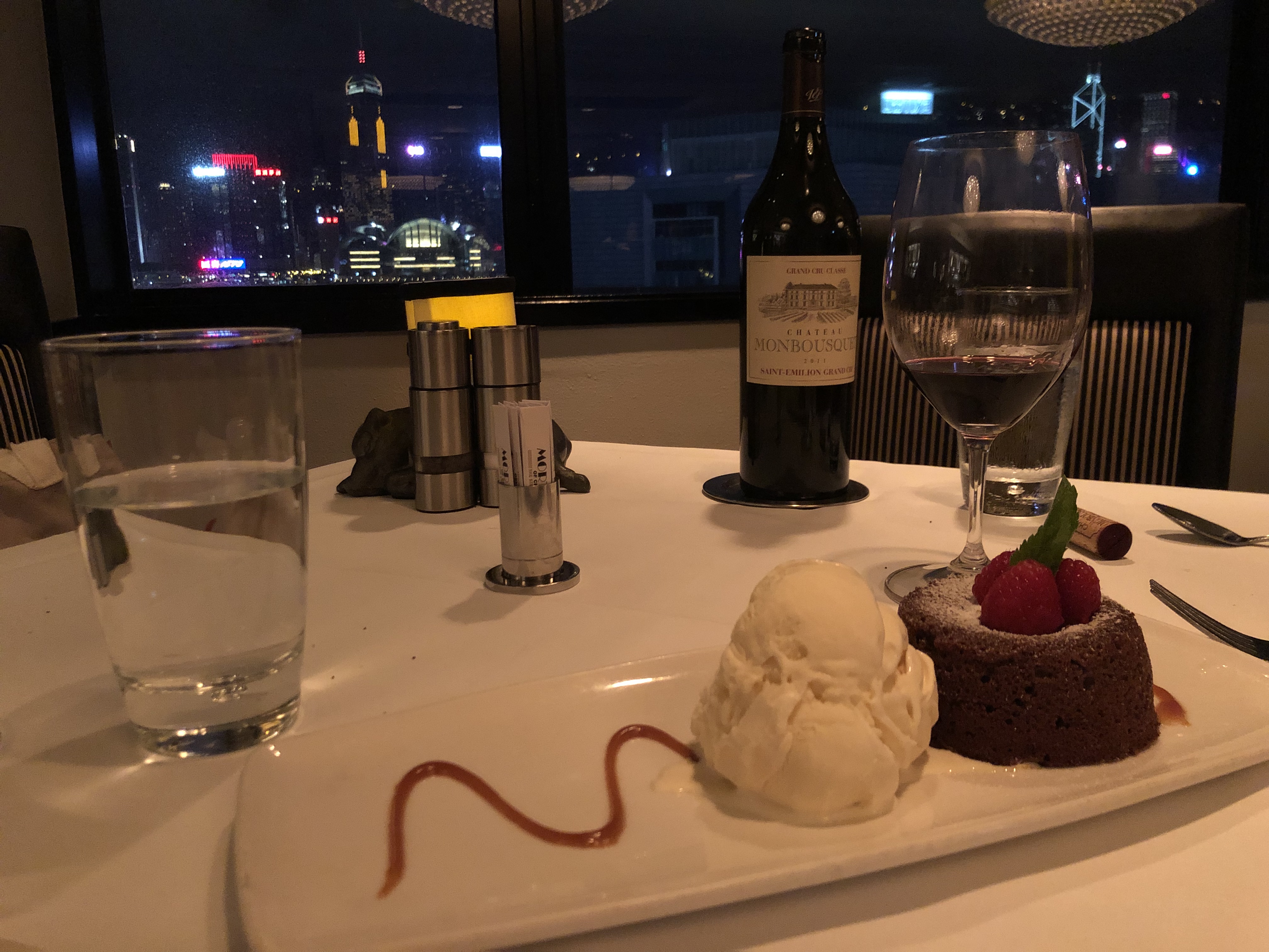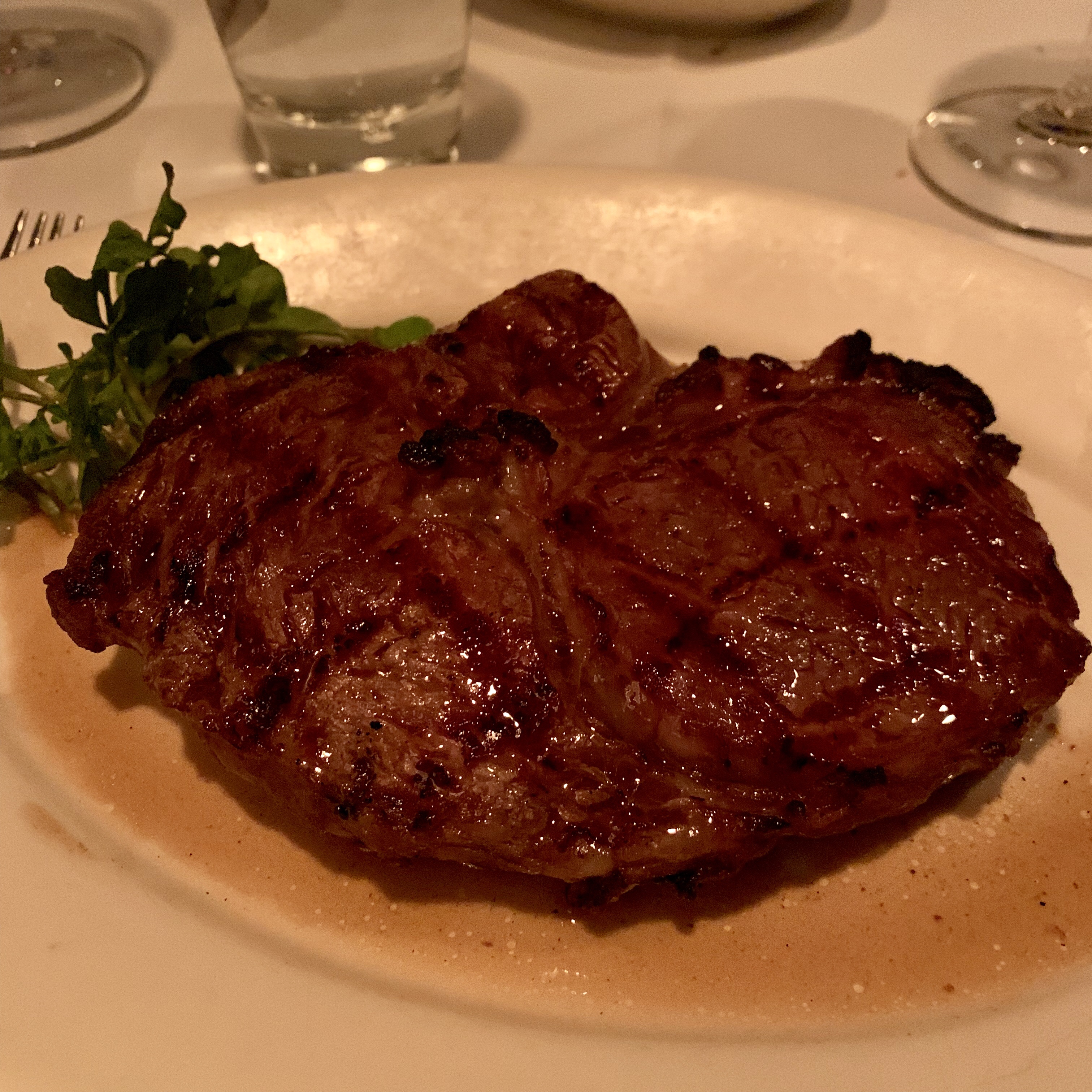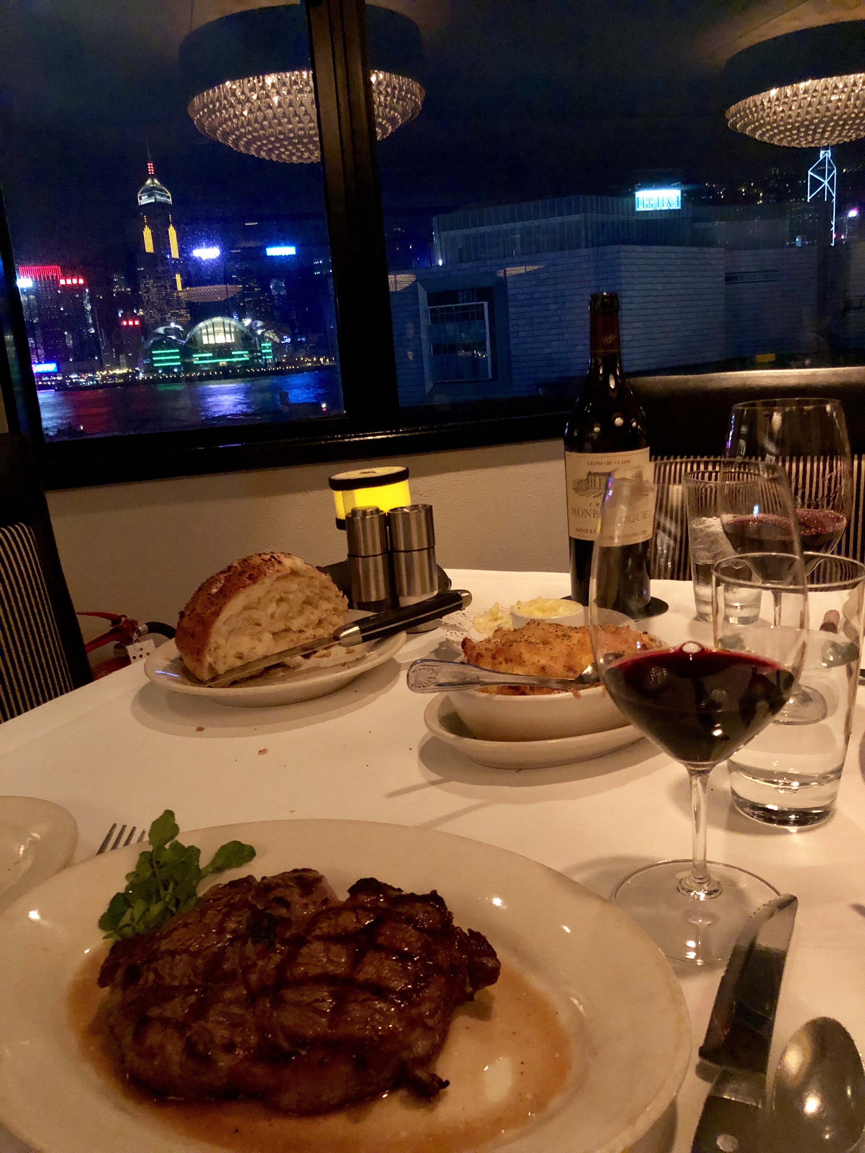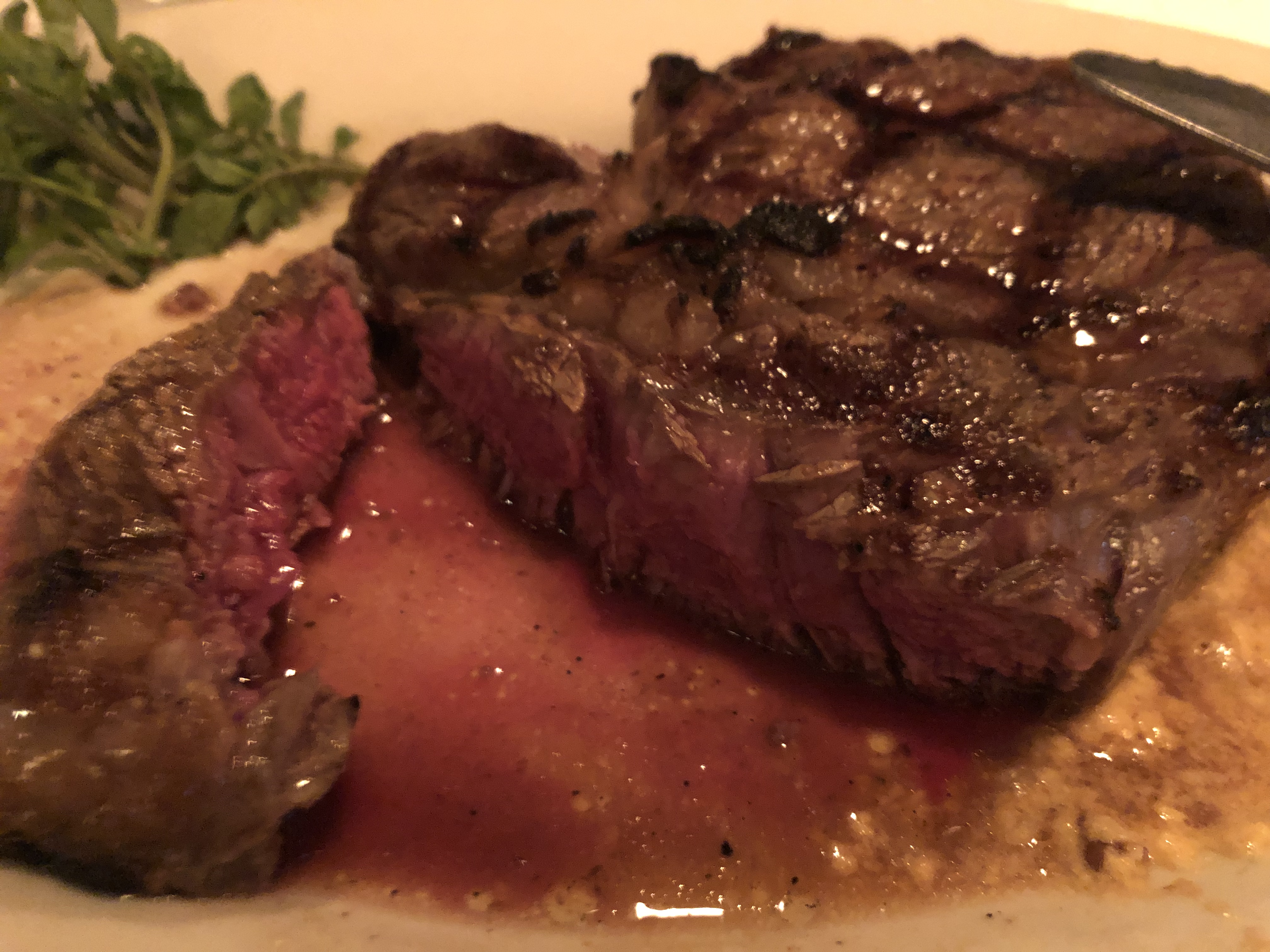 Bone-in rib eye finally arrived . Smell sooooooo good. Cheers with my dining partner then we started to dig in our own steak. When I cut out a small, the pink colour and the texture was good. I started to put a piece into my mouth, oh my god , it’s very juicy, meltingly soft, tender and or rich meat flavour! That’s really perfectly cooked! I was super excited and then looked at Jean, he reacted the same ! A side note, Jean is a very good chef (for leisure) and we like to buy very good quality cuts and cook at home with different or a mix of techniques ( sous vide , oven grilled , charcoal barbecue, etc) as it’s not easy to control the combination of good quality beef and cooking technique when dining outside. Coming back to the table, the first sentence I told Jean after my first bite on the steak was ,” oh my god , it beats your juicy steak! ” Seriously , it is really a top quality steak house among those famous steakhouses we two have tried in Asia, US , Australia, New Zealand and even Argentina. But to be fair, this is an American steak house , I should not compare it with Argentina or Australian steak house since by default they are using completely different cooking method and sourcing different beef that I like all of them . If to compare only among American steak houses we two tried, this medium rare bone-in rib eye was far above our expectation ! Indeed, this comes with a high end price as well. I was satisfied as the wine Jean picked matched so well with this steak too. Even though the staff put some French mustard aside , I didn’t even want to touch that mustard to avoid ruining the nice flavour from my steak.