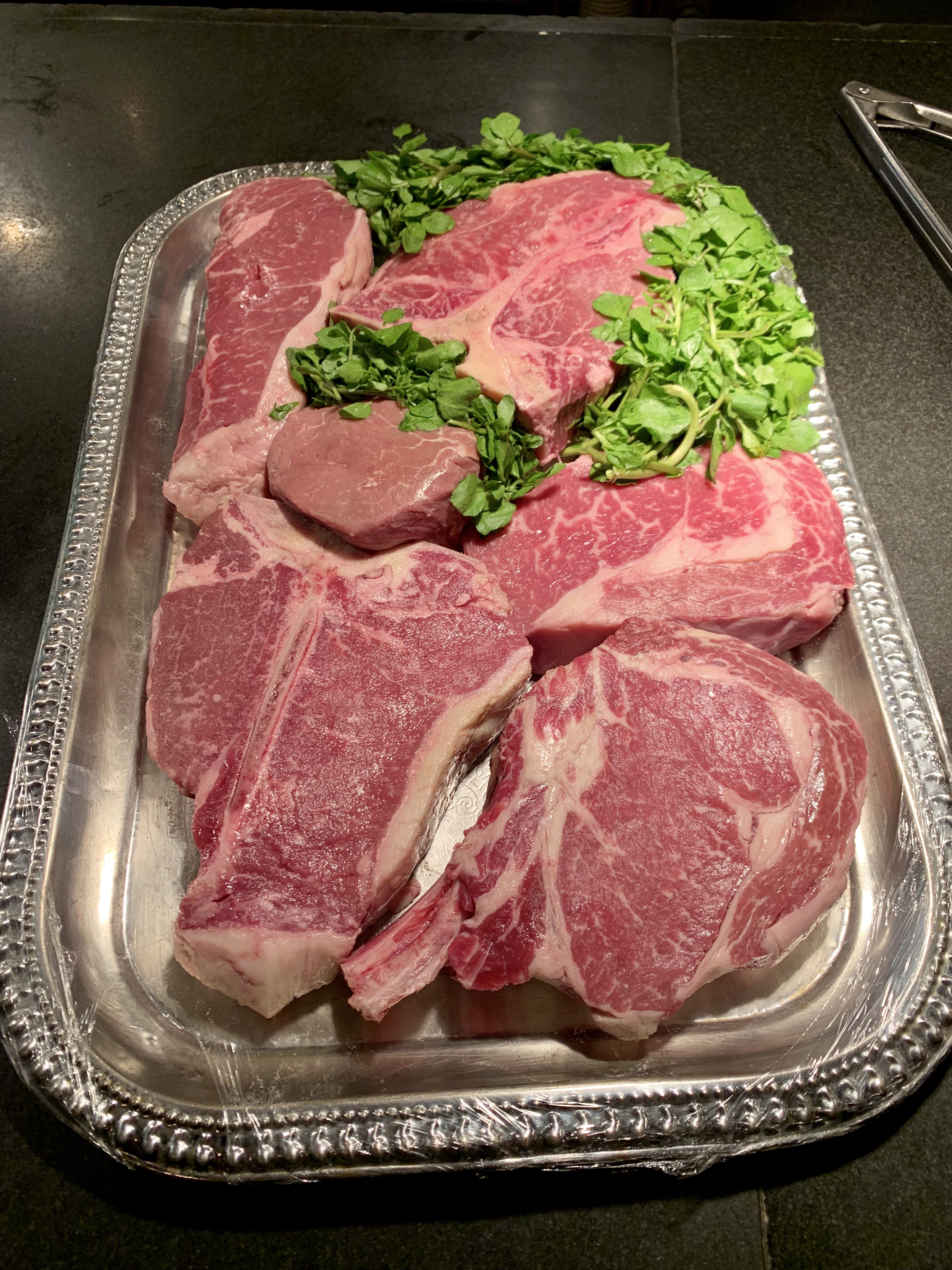 We first looked at the menu and we were like “we want to try everything ” lol . After a while, a staff brought along with him a big metallic plate with all (except one) choices of raw steak on it and started to explain in details the characteristics of different cuts. See below photo