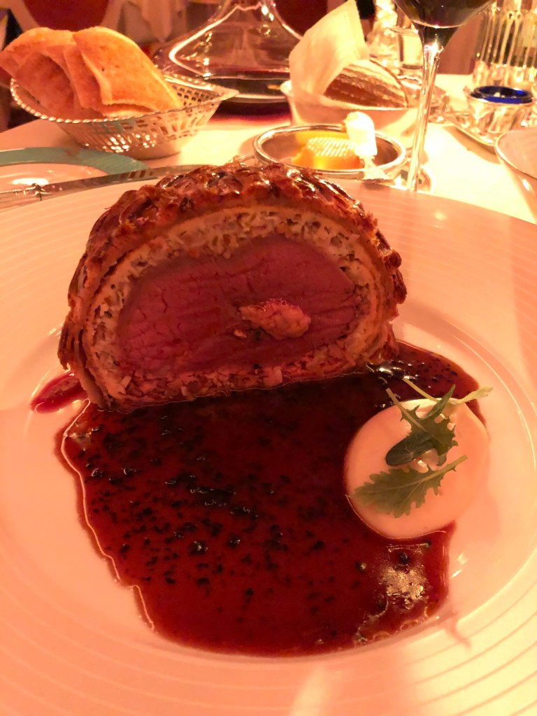 Beef Wellington : I was quite skeptical first when Jean was obsessed to order this. I prefer medium rare streak as more juicy and less chewy and I kept worrying about our choice of beef wellington. Ok, it finally arrived. Interestingly, the waiter was pushing a food trolley towards us. When he opened the ceramic plate cover, it lied with a “pineapple look” crispy big “egg” on the plate. It looks quite cute as if an ostrich egg size object there but the smell was so good. Then the waiter explained about this crispy egg and put it on the wooden chopping board to prepare it for serving. I was a bit nervous how the meat would look like as I told you earlier. When he first cut off the ends and my eyes kept focusing on the centre of meat, I could not believe my eyes, oh my god, seriously, the centre was perfectly done as medium rare as I wanted while the covering pastry was so crispy. After the waiter put in on the plate, he added the sauce and the purree to make it look perfect to serve. When I cut it, I just kept nodding my head and then I started to work on it. It was marvellous! The taste was perfect, meat was tender , temperature was at best, rich flavour, pastry was well layered. I didn’t expect this “look great” restaurant would be able to deliver this dish far beyond expectation. I gave it a 100% score as it’s seriously the best beef wellington I tried after all (I may not try all you tried, so just among my limited sampling size experiences 🙂 ). I would highly recommend this dish if you plan a dining experience here. Beef Wellington