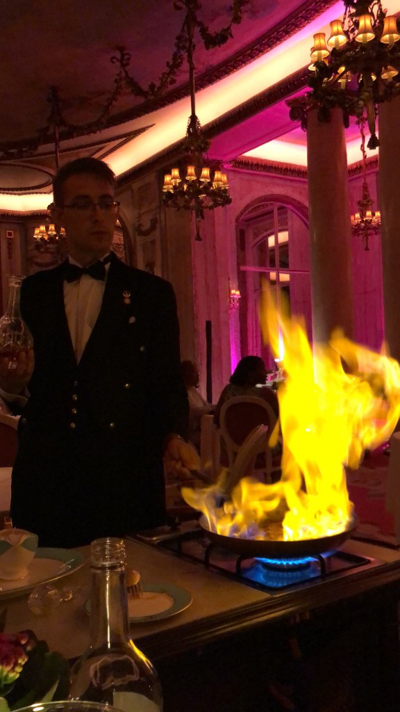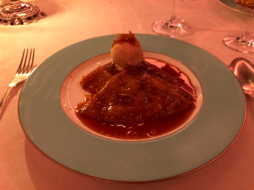 Crepes Suzzette : We were quite full after the main course but indeed I love crepe suzette so much and would like to try here too. We have been dining for quite long time here as we enjoyed so much while some tables next to us have left already though we arrived the same time lol. Interesting enough, the waiter already cleaned up and reset the table next to us, but suddenly he came to re-set the table again and put a ceramic tea pot with cups and some flower on it, I wonder, seriously , are you going to set up for tomorrow morning? But they only did it for one table but not the rest. And then I observed another waiter came out pushing a food trolley with a pan and some crepe suzette ingredients and finally stopped the trolley just in front of this reset table. So sweet, they wanted to set up properly the table behind as a background scene for us to enjoy his performance of cooking the crepes suzette for us. What a lovely detail. He had been explaining the story of crepe suzette and then explained every step he did while preparing the dessert. Every step was very dedicated and indeed I enjoyed the most “the fire scene” as usual and I love so much the liquor fragrance. The waiter carefully prepared the settings of the dessert and served on our table with a vanilla ice cream 🙂 . OK, what I was concerned at this moment was ” would the crepes be too soft after he played for long time in the sauce ?!?” , quite skeptical eyes I had. Ok, I was tasting it finally and to my surprise when the crepes were swimming so long time in the orange juice and liquor, it was still keeping a chewing texture. Great, it passed and exceed the expectation! The fragrance was so good and I love so much to have this dessert as the finale of the meal (of course there were some Pettit fours as usual at the very last). I gave it 90% score.
