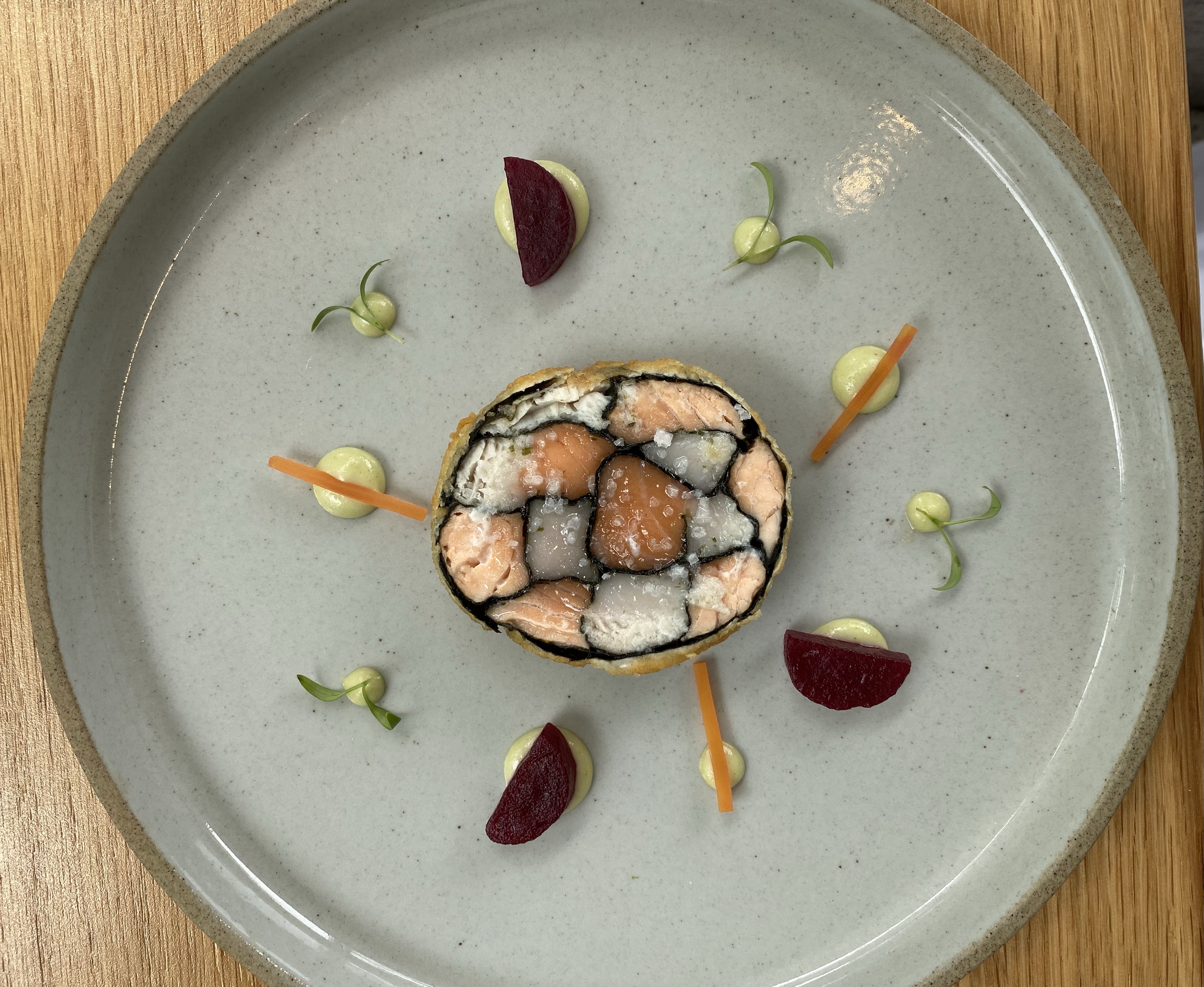 3rd Course : Travelling to Australia & England- “Cured Salmon and Harmachi Tempura. Wasabi Aioli and picked Beetroot”