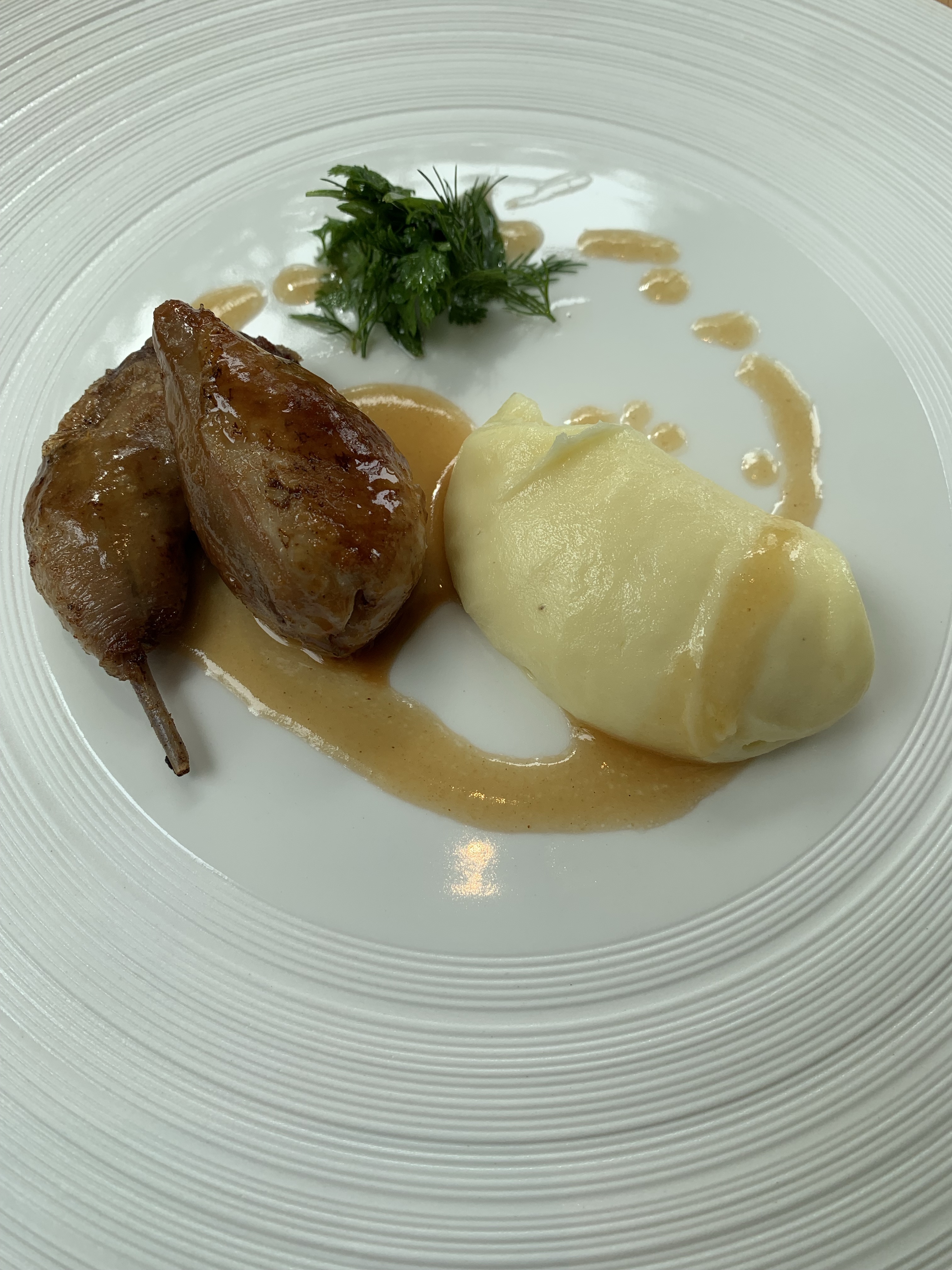 7th Course : Travelling to Paris- La caille au foie gras, caramelisee avec une puree de pommes de terre”